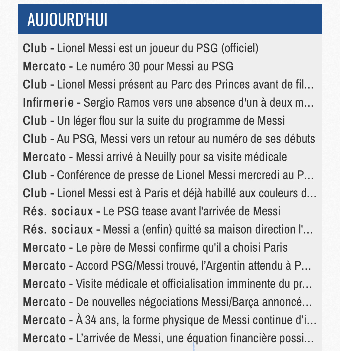 j'arrive pas à être hyper engoué par sa venue, il est pré-retraité et son profil n'était pas tellement nécessaire à mon gout, c'est un cran en dessous de la venue de Neymar, joueur dans son prime ayant accepté de quitter son cocon du barça pour prendre en main une équipe aspirante à la victoire finale en ligue des champions, par exemple bonne chance à lui tout de même ! Je partage complètement ton propos et j'étais d'ailleurs plutôt contre sa venue sur le principe il y a quelques mois (bon vu que son arrivée ne s'est pas faite au détriment d'un latéral droit et d'un milieu, ça change la donne). Mais hier et aujourd'hui j'étais en mode groupie à suivre son avion et avec 4 flux vidéos en direct (Infosport, Marca, Brut et Media Parisien)... Comme un gosse, pour avoir 2 séances de 10s de Messi habillé avec un t-shirt "ici c'est Paris". Kiffons ! |