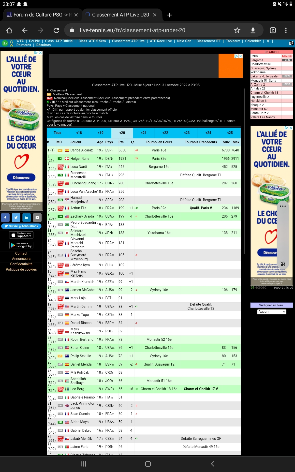 Gillou qui repousse les adieux. Sinon du côté des jeunes, Van Assche a eu une progression constante, un titre en Futures et deux finales en Challenger. 204 mondial, une victoire contre un Top 100, et une défaite au Tie-break du 3è contre Nishioka. C’est vraiment intéressant. C’est un vrai pot de colle, un calvaire pour lui mettre un point, mais pas encore tranchant offensivement. Arthur Fils vient de sortir Fognini pour atteindre le tableau principal, avec un premier tour demain contre ... Fognini, Lucky Loser. Début de saison frustrant pour lui avec plein de défaites sur des matchs serrés mais ça commence à se débloquer. Il est beaucoup plus physique que Van Assche, j’ai tendance à lui voir plus d’avenir mais les projections à cet âge c’est vraiment fragile. Classement chez les -20 ans actuels (tenir compte de l’âge qui importe vraiment dans cette période de carrière à la course aux points) : ![]() Enfin, désolé de mettre cette saloperie ici mais c’est tellement un fléau chez les jeunes en WTA