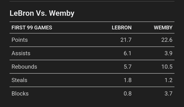 Mais évidemment qu'il est incroyable Et par rapport au GOAT ? Citation Michael Jordan averaged 27.2 points, 6.0 rebounds and 5.5 assists in 100 games in his first 100 games in his career. Vs victor He's totaled 2,273 PTS, 1,053 REB and 366 BLK through his first 100 games. Devant en rebonds et blocs (logique), derrière nettement en points et en assists |