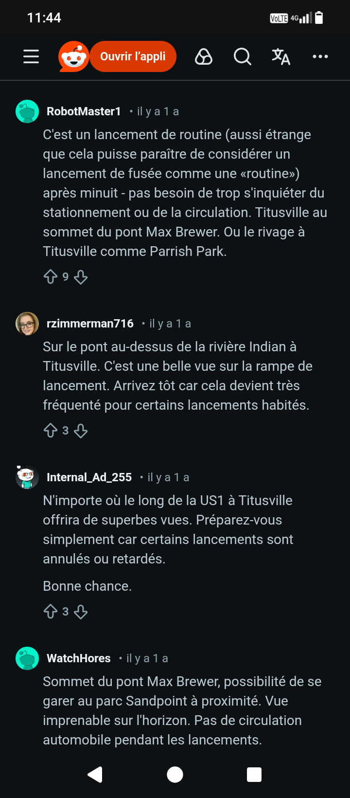 Si tu n'es pas loin de Cocoa Beach, c'est un chouette endroit pout voir les decollages du pas de tir 39A. Il y a un tir presque tous les deux/trois jours (c'est quand meme fou d'ecrire ca), tu as la liste ici: https://www.spacex.com/launches Merci pour le plan et ouais j'ai déjà été me renseigner sur ou les voir gratuitement. https://www.bons-plans-voyage-floride.com/o...-cap-canaveral/ Titusville revient aussi énormément mais pour un lancement comme celui de Artemis ce sera un enfer sur les sites gratuits