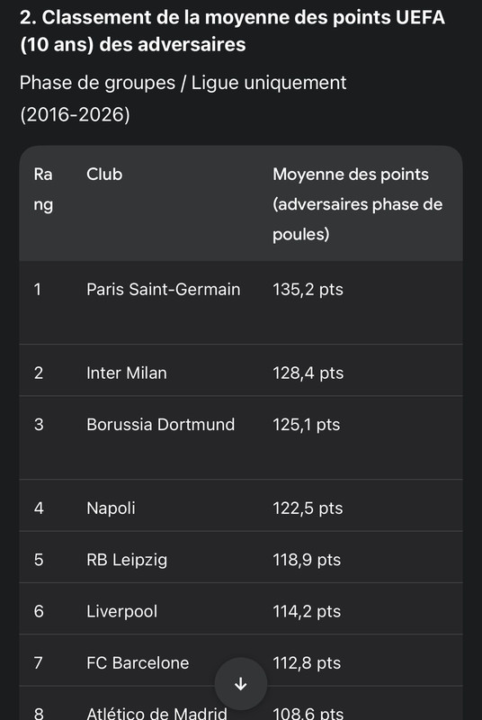 ![]() En gros, il a regardé avec l’IA pour toutes les phases de Groupe sur ses 10 dernières années la moyenne au classement UEFA des adversaires que chaque équipe a rencontré. Ça confirme l’impression de tout le monde. À savoir qu’on est systématiquement pénalisé par les protections nationales. Il faudrait que Nasser fasse du lobying pour changer cette règle. Il a vérifié comment le calcul été effectué. |