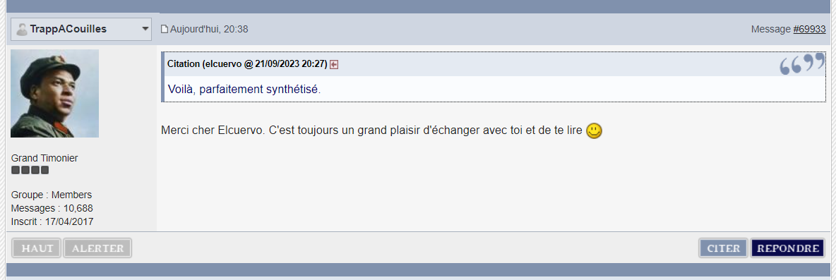 Il y en a, mais "la majorité"... non... dsl les mots ont un sens. Les gars choisissez un meilleur timing la prochaine fois, il y a des posts qui piquent à trois jours de les affronter. RAF, comme le nom de leur quartier du quart-monde, je les mets quasi tous dans le même panier. Il y a que René qu'on aime (et qui manque). Je me suis mal fait comprendre. Si on se limite au football, il est clair qu'il n'y a pas pire, du moins en France, que les supporters marseillais. Totalement paranoïaques, convaincus d'être victimes d'un complot parisien, incurablement négationnistes vis-à-vis des turpitudes dont s'est rendu coupable leur idole, feu BT, incapables d'admettre que leur ville s'apparente à une poubelle malodorante doublée d'un coupe-gorge et j'en passe et des pires... En revanche, quand tu évites de parler football avec eux, bon nombre desdits supporters phocéens se révèlent être de bons gars... |
