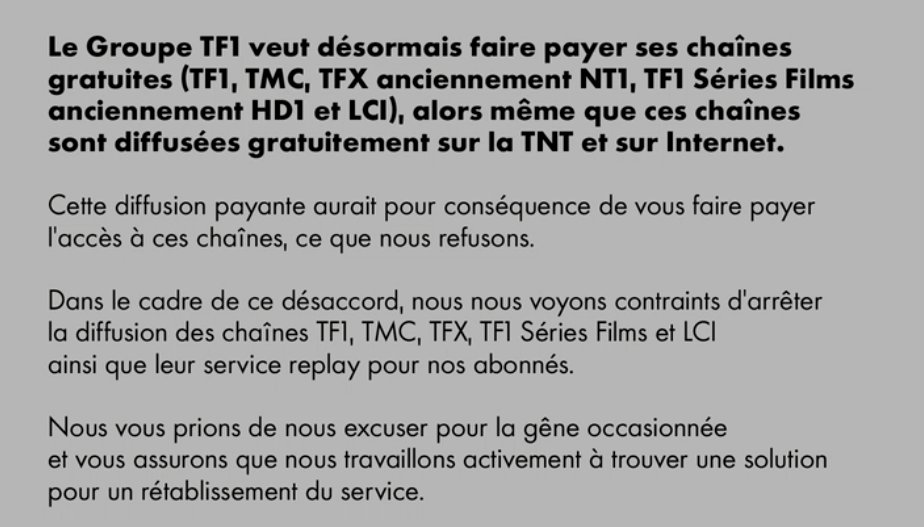 Je ne comprends pas vraiment, qui passe par sa box pour avoir les chaines normales ? Perso, je ne passe JAMAIS par la box, ça m'oblige à gérer 2 télécommandes (dans mon cas 3 car elle est reliée à mon ampli). Alors, je sais que le problème est d'un tout autre ordre (enter C+ et TF1) mais l'utilisateur lambda, ça ne change absolument rien ou alors, j'ai raté quelque chose. Il y a un truc qui s'appelle une télécommande universelle qui simplifie la vie. TF1 qui menace de couper les droits de diffusion, et qui se plaint quand des opérateurs le font de leur propre chef Ils ont encore une vraie audience ? Ça fait un bail que je n'ai pas regardé une chaîne de leur groupe...plus de foot, pratiquement plus de cinéma... |