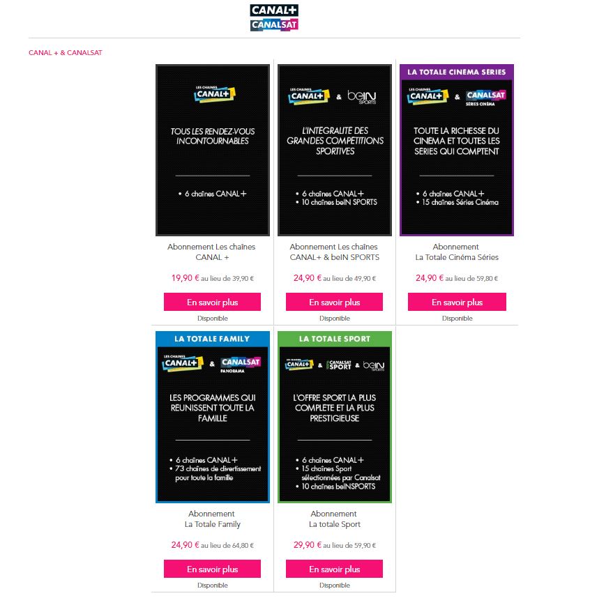 1) canal+ les 6 chaines = 20€ pendant 2 ans 2) canal+ les 6 chaines + BeIn Sport = 25€ pendant 2 ans 3) canal+ les 6 chaines + BeIn Sport + 100% canal sport (eurosport...) = 30€ pendant 2 ans Sous les modes de réception possible (box ADSL ou cube) + My Canal + frais d’accès offert |