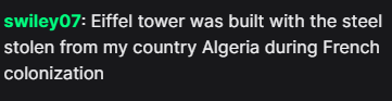 ![]() Est il en train d'insinuer que la tour Eiffel est algérienne ? En vrai on a mieux utilisé leurs fers qu'eux non? |