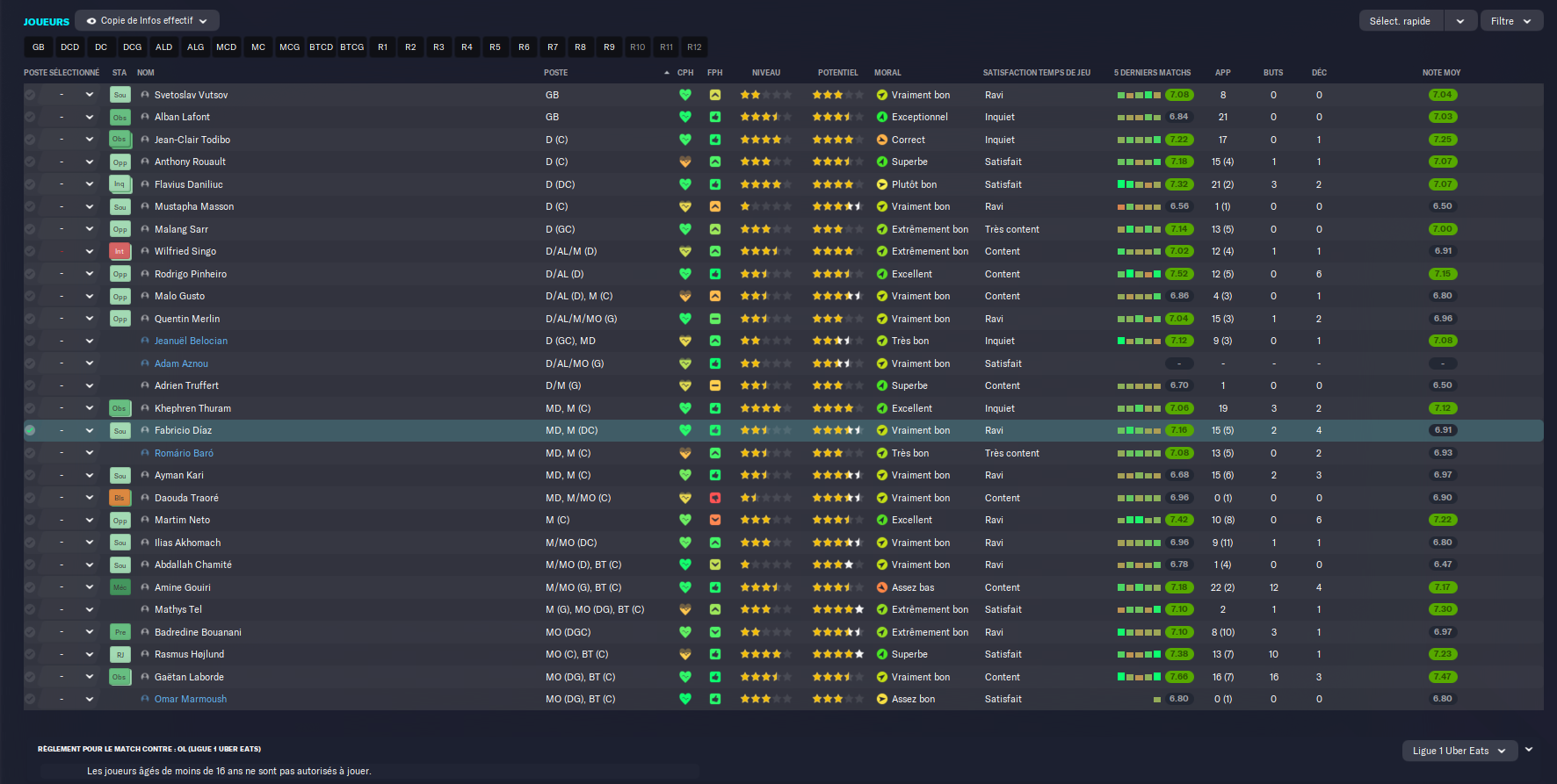 Mon effectif avec Nice au bout de 2 ans. Ma balance transfert sur la période est de +28M€ et -1.2M€ sur le budget salarial mensuel donc excellent niveau finances. 1ère demi saison: je remonte de 11ème à 6ème 2ème saison: 2ème et 8ème de finale Europa 3ème saison (fin janvier): 2ème et j'ai terminé 9ème à la diff de but du nouveau truc de LDC donc je vais jouer le barrage. J'ai quand même des sacré cracks: Lafont, Todibo, Daniluc, Thuram, Hojlund, Gouiri, Laborde. Plein de jeunes dont Mathys Tel que je viens de chiper au Bayen Tous les prêts sont avec option. Masson et Chamité c'est des regens de 16 ans. Je joue dans 2 systèmes: x x-x-x x---------x x-x-x x-x ou x