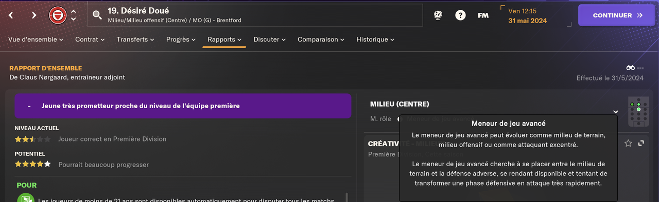 Mais il y a un truc que je ne pige pas. Je lui avait fait la promesse de le faire jouer Meneur de jeu avancé (ce que j'ai fait) mais à chaque fois il me casse les couilles en disant que je ne le fait pas jouer au poste promis. Il a joué toute la fin de saison à ce poste, peut être que quelque chose m'échappe. Est ce que quelqu'un a déja eu ce problème ? Merci. |