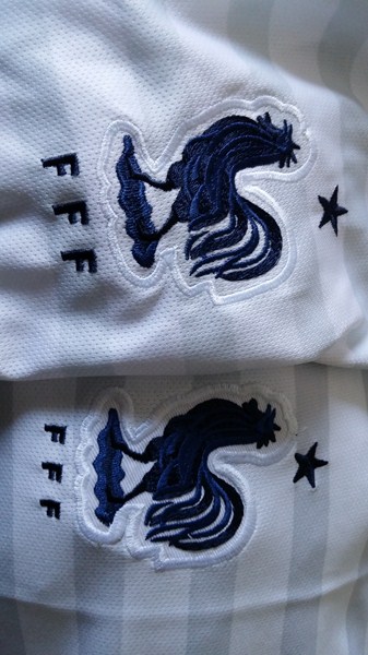 J'avais commandé un maillot France Away pour mon beau frére (j'avais commandé le même chez Chuan Ji). Je les ai comparé et voici les différences : les deux logos ne sont pas identiques . ça se joue au niveau du "fond" du coq. Je suis allé vérifié en magasin et celui de Jason Lee se rapproche du vrai. Tout comme l'écriture "FFF" qui n'a pas la même taille. Celui de Jason Lee est encore plus proche de la réalité. Par contre l'étoile au dessus du coq et trop bas chez Jason Lee. Pour le reste, c'est quasiment identique. (quelques fils à couper) Chuan Ji en haut, Jason Lee en bas J'ai également commandé le France Away 2013 et celui là est vraiment magnifique ! Aucun défaut, on dirait que c'est un vrai. Les logos sont thermocollés donc pas de fils qui dépassent. Il y a même les T au niveau des épaules. Le France home a un tout petit soucis au niveau de la couture du "DRI-FIT" Concernant mon maillot REAL MADRID commandé chez Chuan Ji , ce dernier semble avoir pris une drôle de couleur aprés le 1er lavage... (les traits qui étaient blanc/gris au départ sont devenu un peu jaune). Pourtant je ne l'ai lavé qu'avec du blanc, 30°C, essorage faible. (avec lingette decolor stop ...) Pour conclure -> Jason Lee : un peu long (1 mois et une semaine) mais maillot semble mieux fait Chuan Ji : Rapide (environ 2 semaines) mais un peu déçu de la qualité (maillot Japon était pleins de défaut, Maillot Real a "déteint", et maillot France moins ressemblant si on compare avec un vrai) |