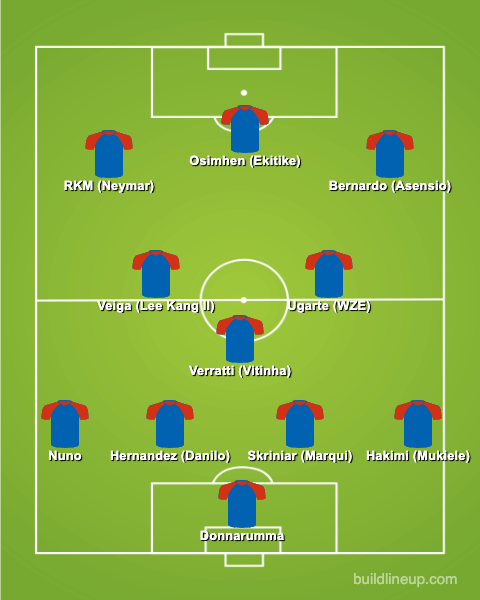 Latéral droit : Hakimi / Mukiele Latéral gauche : Nuno / X Centraux : Skriniar / Marquinhos / Danilo / Hernandez / Kimpembe Milieu : Ugarte / Zaïre / Vitinha / Verratti / X / X Attaquant : Ascencio / Lee / X / X / X / X A cette heure ci t'es peut être même pas favori de L1. Va falloir se bouger |