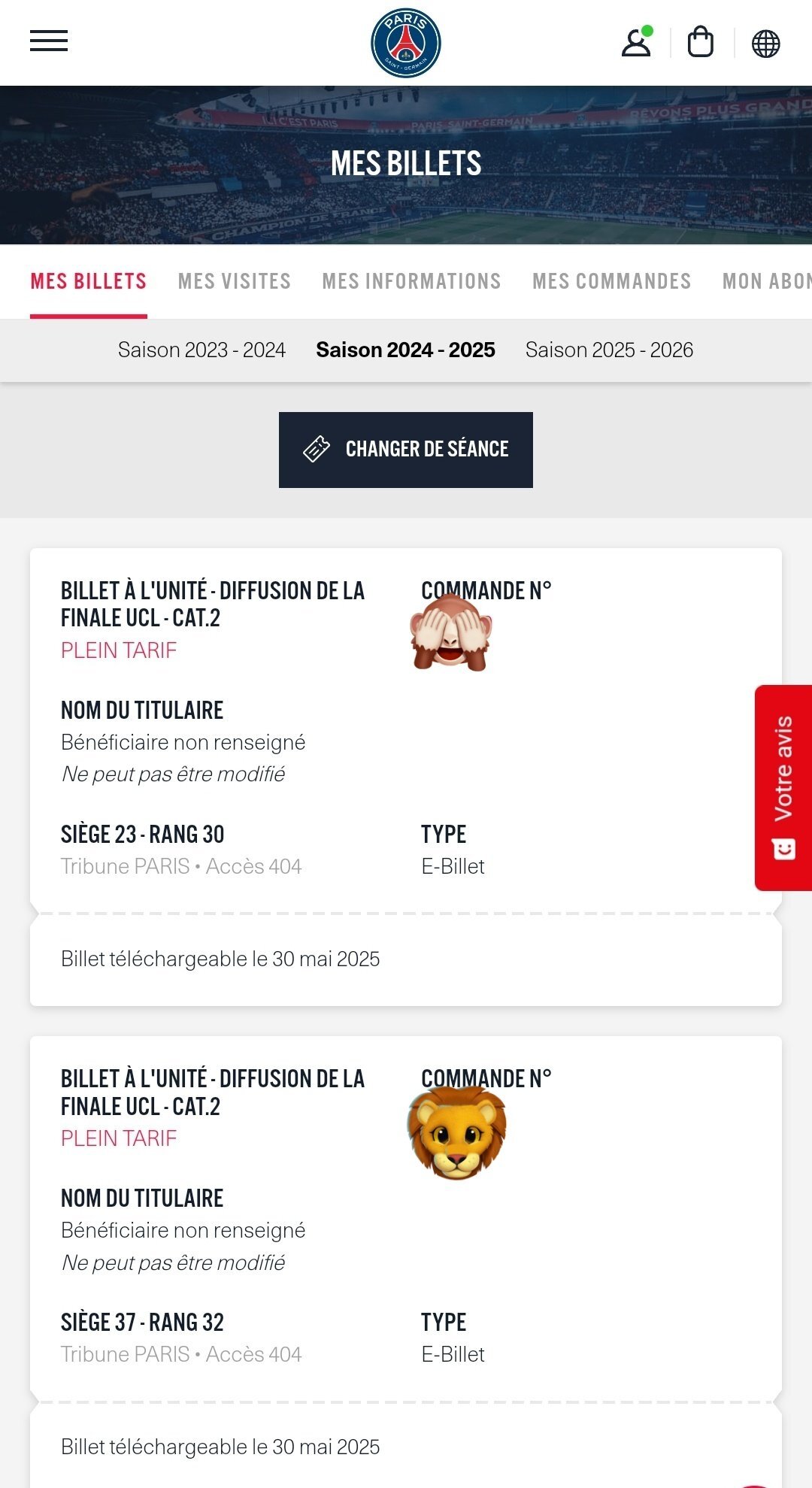 Je peut potentiellement tous nous arranger. Rjay mate tes mp On va se débrouiller entre tonio path et moi ça devrait le faire. Vous pensez qu'ils vont faire chier pour le placement en 404, 103, etc ? C'est un peu contraignant alors qu'on va pour la plupart chercher à se regrouper. Quelqu'un aurait des infos ? ![]() C'est une annonce ressemblant donc à un achat de deux places et déjà la elles sont même pas groupées, comme dit par mp je voit pas comment ils pourraient gérer un placement strict vu le nombre de groupes à avoir plusieurs lots de deux places vu qu'on peut pas acheter plus par transaction, j'ai demandé à Wil qui a acheté deux places de mater si ses places étaient côte à côte ou pas comme sur l'annonce Twitter ci dessus, les autres abos qui ont achetés des places, si vous pouvez nous renseigner c'est super Et j'ai tenté de joindre le PSG j'ai pas trouvé de ligne téléphonique ou ça réponds, le PSG quoi, reste les réseaux. On en est ou au final? Tu auras tes places. Désolé j'attends une réponse ce soir pour voir si ça simplifie entre Tonio, toi et moi, mais on aura les places. Merciiiiiiiiiiiiiii La confrérie CulturePSG Si jamais certains cherchent encore ma fille à un contact qui a toujours des places pour le Parc le 31, genre à Boulogne accès 327 il en avait encore ce soir, ce matin à Auteuil.etc. -------------------- Champion Comunio 🇲🇫 2019 🏆 2021 🏆 2022 🏆
